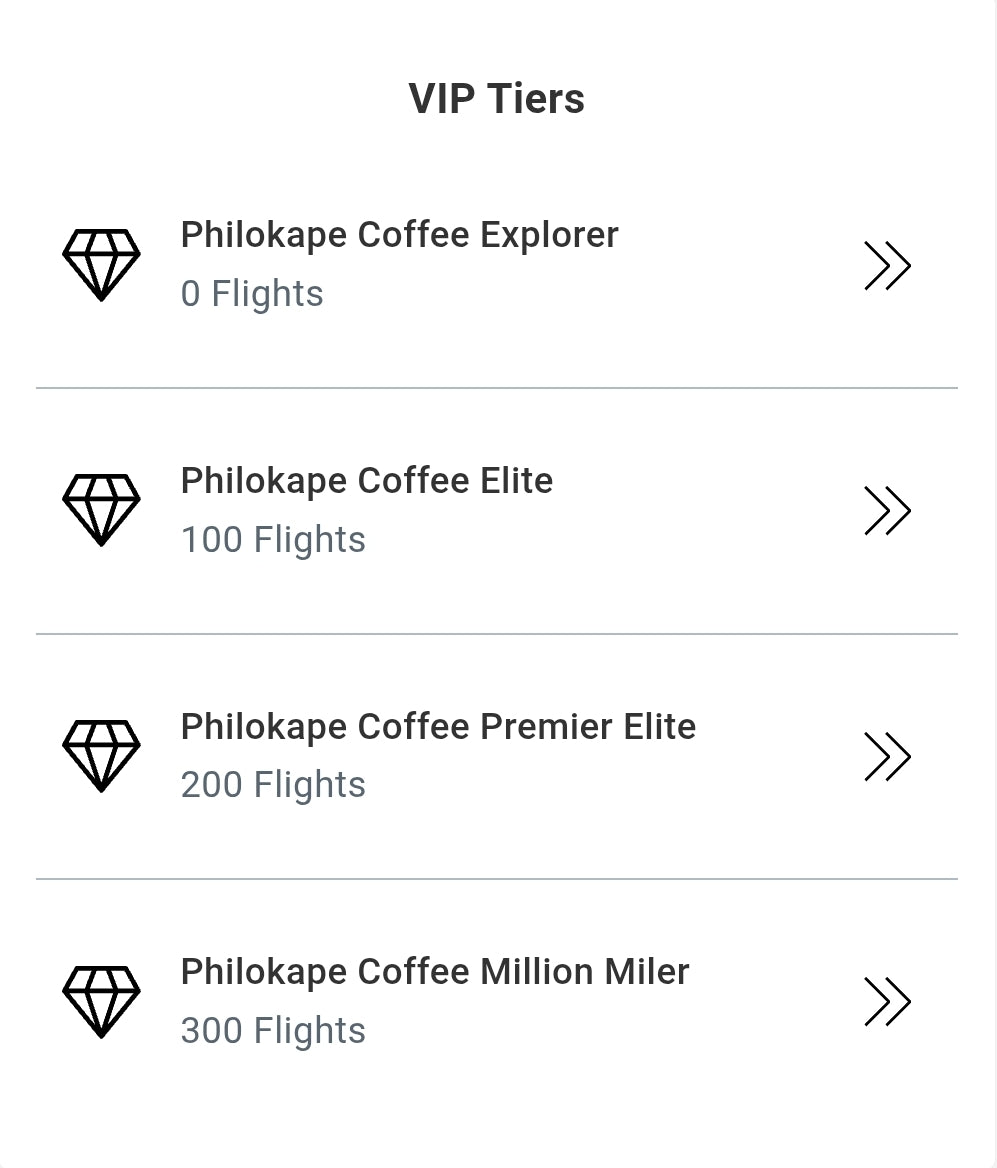 • Free drink after completing 12 flight stamps and get rewarded as a loyal coffee high flyer as you move up the VIP tier rank with first class perks!